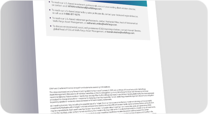 We want to help clients build for successful outcomes, defend portfolios against uncertainty, and create long-term financial well-being. To learn more, investment professionals can contact us: l To reach our U.S.-based investment professionals, contact your existing client relations director, or contact us at WFAMInstitutional@wellsfargo.com. l To reach our U.S.-based intermediary sales professionals, contact your dedicated regional director, or call us at 1-888-877-9275. l To reach our U.S.-based retirement professionals, contact Nathaniel Miles, head of Retirement at Wells Fargo Asset Management, at nathaniel.s.miles@wellsfargo.com. l To discuss environmental, social, and governance (ESG) investing solutions, contact Hannah Skeates, global head of ESG at Wells Fargo Asset Management, at hannah.skeates@wellsfargo.com. CFA® and Chartered Financial Analyst® are trademarks owned by CFA Institute. The views expressed and any forward-looking statements are as of January 1, 2020, and are those of the authors and/or Wells Fargo Asset Management. Discussions of individual securities, or the markets generally ells Fargo Fund are not intended as individual , or any W recommendations. Future events or results may vary significantly from those expressed in any forward-looking statements; the views expressed are subject to change at any time in response to changing circumstances in the market. Wells Fargo Asset Management disclaims any obligation to publicly update or revise any views expressed or forward-looking statements. All investing involves risks, including the possible loss of principal. There can be no assurance that any investment strategy will be successful. Investments fluctuate with changes in market and economic conditions and in different environments due to numerous factors, some of which may be unpredictable. Each asset class has its own risk and return characteristics. Investing in environmental, social, and governance (ESG) carries the risk that, under certain market conditions, the investments may underperform products that invest in a broader array of investments. In addition, some ESG investments may be dependent on government tax incentives and subsidies and on political support for certain environmental technologies and companies. The ESG sector also may have challenges such as a limited number of issuers and liquidity in the market, including a robust secondary market. Investing primarily in responsible investments carries the risk that, under certain market conditions, an investment may underperform funds that do not use a responsible investment strategy. Wells Fargo Asset Management (WFAM) is the trade name for certain investment advisory/management firms owned by Wells Fargo & Company. These firms include but are not limited to Wells Capital Management Incorporated and Wells Fargo Funds Management, LLC. Certain products managed by WFAM entities are distributed by Wells Fargo Funds Distributor, LLC (a broker-dealer and Member FINRA). n n INVESTMENT PRODUCTS: NOT FDIC INSURED NO BANK GUARANTEE MAY LOSE VALUE © 2020 Wells Fargo & Company. All rights reserved. WFAM 408726 1-20