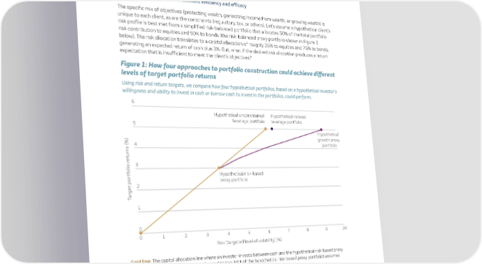 Why is this innovative? Because innovation implies improvement, and we think risk-based portfolio construction can do the following: • Produce a better range of outcomes than traditional asset allocation • Specifically, lead to portfolios that can more readily withstand uncertain market conditions and that are more relevant to solving real-world problems • Overall, improve both investment efficiency and efficacy The specific mix of objectives (protecting wealth, generating income from wealth, or growing wealth) is unique to each client, as are the constraints (regulatory, tax, or others). Let’s assume a hypothetical client’s risk profile is best met from a simplified risk-balanced portfolio that allocates 50% of the total portfolio risk contribution to equities and 50% to bonds (the risk-balanced proxy portfolio shown in Figure 1 below). The risk allocation translates to a capital allocation of roughly 25% to equities and 75% to bonds, generating an expected return of cash plus 3%. But, what if the desired risk allocation produces a return expectation that is insufficient to meet the client’s objectives? Figure 1: How four approaches to portfolio construction could achieve different levels of target portfolio returns Using risk and return targets, we compare how four hypothetical portfolios, based on a hypothetical investor’s willingness and ability to invest in cash or borrow cash to invest in the portfolios, could perform. 6 Hypothetical unconstrained Hypothetical relaxed 5 leverage portfolio leverage portfolio Hypothetical growth proxy 4 portfolio eturns (%) 3 olio r tf Hypothetical risk-based proxy portfolio 2 get por ar T 1 0 0 1 2 3 4 5 6 7 8 9 10 Risk (targeted level of volatility) (%) Gold line: The capital allocation line where an investor invests between cash and the hypothetical risk-based proxy portfolio. To aim for a higher return (up and to the right of the hypothetical risk-based proxy portfolio) assumes borrowing to invest in the hypothetical risk-based proxy portfolio. Purple line: Trajectory for the portfolio holder who does not add leverage. Here the path to pursuing higher returns entails taking on more risk compared with investing along the gold line. Portfolios along this line may be more concentrated, or less diversified, than portfolios along the gold line. Source: WFAM Multi-Asset Solutions. For illustrative purposes only, not intended to represent investment in any product managed by Wells Fargo Asset Management. Any target is indicative only and not guaranteed in any way. Target figures do not take into account any fees or charges on investment returns. 19 2020