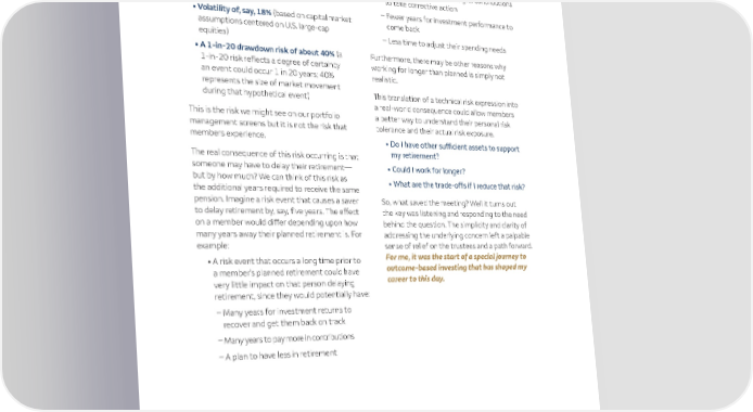 IN TIMES OF CHAOS CHOOSE TO INNOVATE He was right of course. Volatility in this context • Whereas, for someone very close to their means very little. You see, the same technical planned retirement date, a loss that causes them measure of risk for someone 40 years away from to delay retirement by five years would have a planned retirement at age 65 means something greater consequences, since they could have: very different to someone only 5 years away. If – Less time to make meaningful contributions both investors hold a portfolio of equities, then to take corrective action both would face: • Volatility of, say, 18% (based on capital market – Fewer years for investment performance to assumptions centered on U.S. large-cap come back equities) – Less time to adjust their spending needs • A 1-in-20 drawdown risk of about 40% (a Furthermore, there may be other reasons why 1-in-20 risk reflects a degree of certainty working for longer than planned is simply not an event could occur 1 in 20 years; 40% realistic. represents the size of market movement during that hypothetical event) This translation of a technical risk expression into a real-world consequence could allow members This is the risk we might see on our portfolio a better way to understand their personal risk management screens but it is not the risk that tolerance and their actual risk exposure. members experience. • Do I have other sufficient assets to support The real consequence of this risk occurring is that my retirement? someone may have to delay their retirement— • Could I work for longer? but by how much? We can think of this risk as the additional years required to receive the same • What are the trade-offs if I reduce that risk? pension. Imagine a risk event that causes a saver So, what saved the meeting? Well it turns out to delay retirement by, say, five years. The effect the key was listening and responding to the need on a member would differ depending upon how behind the question. The simplicity and clarity of many years away their planned retirement is. For addressing the underlying concern left a palpable example: sense of relief on the trustees and a path forward. • A risk event that occurs a long time prior to For me, it was the start of a special journey to a member’s planned retirement could have outcome-based investing that has shaped my very little impact on that person delaying career to this day. retirement, since they would potentially have: – Many years for investment returns to recover and get them back on track – Many years to pay more in contributions – A plan to have less in retirement 22