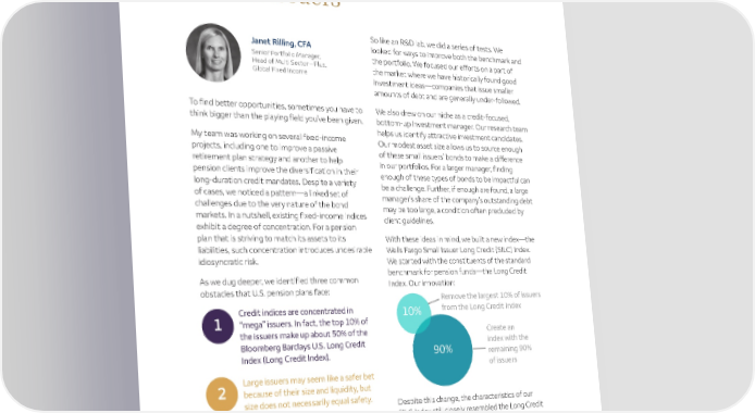 INVESTMENT DISCOVERIES Building a new playing field with smaller issuers So like an R&D lab, we did a series of tests. We Janet Rilling, CFA looked for ways to improve both the benchmark and Senior Portfolio Manager, the portfolio. We focused our efforts on a part of Head of Multi Sector – Plus, the market where we have historically found good Global Fixed Income investment ideas—companies that issue smaller amounts of debt and are generally under-followed. To find better opportunities, sometimes you have to We also drew on our niche as a credit-focused, think bigger than the playing field you’ve been given. bottom-up investment manager. Our research team helps us identify attractive investment candidates. My team was working on several fixed-income Our modest asset size allows us to source enough projects, including one to improve a passive retirement plan strategy and another to help of these small issuers’ bonds to make a difference in our portfolios. For a larger manager, finding pension clients improve the diversification in their enough of these types of bonds to be impactful can long-duration credit mandates. Despite a variety be a challenge. Further, if enough are found, a large of cases, we noticed a pattern—a linked set of manager’s share of the company’s outstanding debt challenges due to the very nature of the bond may be too large, a condition often precluded by markets. In a nutshell, existing fixed-income indices client guidelines. exhibit a degree of concentration. For a pension plan that is striving to match its assets to its With these ideas in mind, we built a new index—the liabilities, such concentration introduces undesirable Wells Fargo Small Issuer Long Credit (SILC) Index. idiosyncratic risk. We started with the constituents of the standard benchmark for pension funds—the Long Credit As we dug deeper, we identified three common obstacles that U.S. pension plans face: Index. Our innovation: Remove the largest 10% of issuers Credit indices are concentrated in from the Long Credit Index 10% 1 “mega” issuers. In fact, the top 10% of the issuers make up about 50% of the Create an Bloomberg Barclays U.S. Long Credit index with the 90% Index (Long Credit Index). remaining 90% of issuers 2 Large issuers may seem like a safer bet because of their size and liquidity, but size does not necessarily equal safety. Despite this change, the characteristics of our SILC Index still closely resembled the Long Credit Index across all relevant factors: duration, credit Many large asset managers tend to focus quality, yield, and industry type. But, importantly, 3 their portfolios on these largest issuers, the enhancement removed exposure to the largest compounding the concentration. issuers that pension plans already tend to have a lot of exposure to. 13 2020
