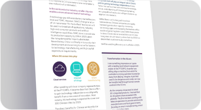 IN TIMES OF CHAOS CHOOSE TO INNOVATE Chinese foundries that fabricate semiconductor Chinese semiconductors’ content and volume: wafers and companies that design integrated cloud services, internet of things, and smart circuits have been focusing on developing a mature manufacturing. generation of chips and specialty applications. For In our team’s view, on-the-ground insights like example, SMIC, China’s largest and most advanced foundry, can provide integrated circuit foundry and these can place us in a strong position to identify technology services on process technology from companies that will play an integral role in China’s 0.35 microns to 14 nanometers (one nanometer is path to gaining technology independence. It also one-millionth of a millimeter). helps that we’re armed with rich local knowledge, a true understanding of Chinese policymaking and geopolitical issues, and a diligent bottom-up In the semiconductor industry, smaller chip size approach to research. enables a more advanced level of technology. While there is still a long path to silicon A technology gap still exists behind market leaders independence, Chinese companies are rapidly Intel and TSMC. However, SMIC’s first generation increasing production capacity, narrowing of 14-nanometer “fin-field effect” transistors will technology gaps, and equipping themselves with a be used in a broad set of applications, including sizable engineering talent pool. With those pieces high-end consumer products and artificial in place, China’s desire to establish a world-class intelligence capabilities. SMIC plans to accelerate integrated circuit industry value chain by 2030 is a its production capacity by 25% in 2020, given dream that could eventually come true. the rising demand for import substitution. Nevertheless, China is still early in its supply chain We’ll be watching this story as it unfolds in 2020. development and is working to solve for barriers to technology, manufacturing, and high capital expenditure requirements. Where 5G comes into play Transformation in the 5G era I saw something impressive as I spoke with a leading local network equipment- maker at the PT EXPO. A worker was sitting atop a machine from which he controlled a mining operation located far Cloud services Internet Smart away from Beijing. Imagine: A job that of things manufacturing used to be dangerous and costly can now be transformed through human remote After speaking with local company representatives control in the 5G era. at the PT EXPO, it became clear that China’s effort to gain technology independence would greatly As the company showcased its latest 5G-integrated products, I learned that benefit from a new wave of innovation. Most its 5G patent share exceeded 20% notably, 5G technology is expected to cover over 300 Chinese cities by 2020. globally. The firm has been working with telecom operators to provide solutions for manufacturers and local governments, The direct benefits for Chinese semiconductor producers are vast, including demand from focusing on smart manufacturing, smart network build-out and handset upgrades. cities, and other areas. Given the faster speed (10 to 20 times faster than 4G) and low latency (short response time —Connie Ou over the networks), we believe that 5G will lead to increasing connectivity and will trigger rising demand for three areas that can boost 12