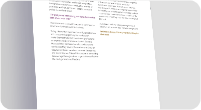 IN TIMES OF CHAOS CHOOSE TO INNOVATE But, I quickly learned that preconceived notions Reflecting on our history, the asset management or self expectations could sometimes trip up even business has changed a great deal since I began my my brightest colleagues, making them unwilling to career. Experiencing its rapid growth, maturity, and ask timely questions or hesitant to take on certain now consolidation over a relatively short period, projects that could reveal ignorance or a blind spot. my peers and I have seen our industry follow a life In contrast, I felt free to ask questions and was cycle similar in trajectory to the various companies encouraged by the response of my peers and team and sectors we have followed across our leaders who appreciated a different perspective. investment disciplines. As much as our business I remember one particular week, after a series of has changed, it remains our ongoing responsibility grueling meetings, someone I deeply respected to identify and allocate capital to the best available pulled me aside and said: opportunities. Investors continue to seek out the investment firms they trust the most to carry out “I’m glad you’ve been raising your hand, because I’ve this task. been afraid to do that.” As I interact with my colleagues day to day, it That comment stuck with me, and it continues to becomes all the more clear from my perspective: drive how I think about this business. Today, I know that the sheer breadth, specialization, In times of change, it’s our people who’ll inspire and constant change in capital markets can that trust. make the most talented investment professional an expert one day and a new student the next. How well they can learn has a lot to do with the confidence they have in themselves and the trust they have in team members to reveal themselves and take initiative. This self-innovation is something I encourage throughout our organization as I look to the next generation of leaders. 24